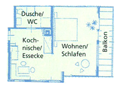 Einem Doppelzimmer mit WC und Dusche. Balkon. TV. Einer Kochnische mit Essecke.